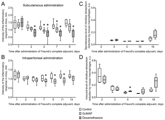 Anti-GcMAF preparation was administered five times at doses ranging from 0.02 ng/mouse to 1.0 μg/mouse on Days 1, 2, (4 or 5), 7, and 9 after arthritis induction. In the experiments using ICR and C57BL/6 mice, anti-GcMAF was administered subcutaneously and intraperitoneally, respectively. Steroidal anti-inflammatory glucocorticoid, dexamethasone (JSC Dalkhimpharm, Khabarovsk, Russia), was chosen as a comparator drug and administered intraperitoneally at a dose of 200 μg/mouse at the same time points as anti-GcMAF. The dose and the dosing schedule of dexamethasone in the preliminary experiment were chosen in accordance with the reported literature data [32]. Control animals received injections of the same saline volume in a similar manner at the same time points as for GcMAF.