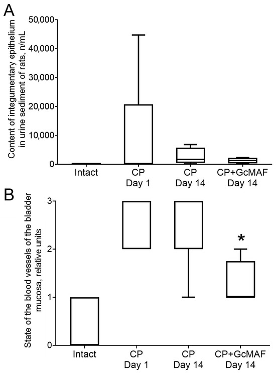 On Days 7, 13, 20, and 24 after the first administration of CP to animals, blood samples were collected from the retro-orbital sinus to perform hematology and blood chemistry tests. Rats were then euthanized by inhaling carbon dioxide, dissected, and subjected to macroscopic examination. Rat bladders were isolated; their weight was measured on a GX−200 analytical balance (A&D Company, Tokyo, Japan); bladder wall thickness was determined using an MCC 25 digital micrometer (LLC NPP “CHIZ”, Chelyabinsk, Russia). Weight indices of bladders (weight of the organ (mg) divided by animal weight (g) and multiplied by 100) were determined. Each bladder was macroscopically analyzed to assess the condition of blood vessels and mucosal bleeding according to the following criteria using the procedure described in ref. [38]: 0—no vascular damage; 1—minor damage to blood vessels (blood vessels of the mucosa are significantly dilated and filled with blood); 2—moderate damage to blood vessels (sporadic hemorrhages); and 3—severe damage to blood vessels (strip-like hemorrhage on the inner or outer side of the bladder wall; hemorrhagic disease).