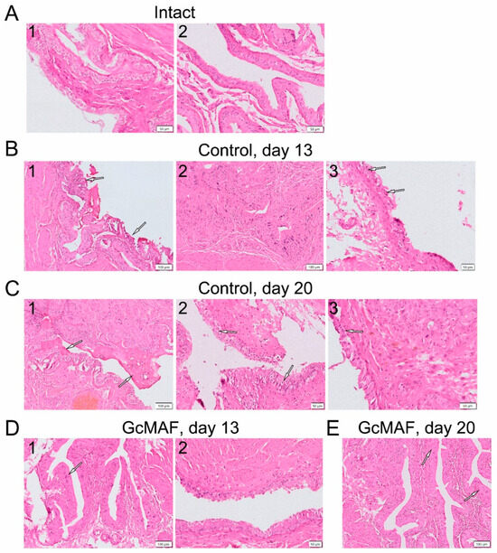 Bladders were fixed in 10% neutral formalin solution (BioVitrum, St. Petersburg, Russia) for 48 h to perform histological analysis. The material was treated using the conventional procedure: sequential dehydration in alcohols of increasing concentration, impregnation in xylene–paraffin mixture, and paraffin embedding. Paraffin sections 4–5 µm thick were prepared on an HM−360 automated rotary microtome (Germany). Sections were stained with hematoxylin and eosin. Light optical analysis was carried out on an Axio Imager Z1 microscope (Carl Zeiss AG, Oberkochen, Germany) using the Axio Vision 4.8.2 software (Carl Zeiss AG, Oberkochen, Germany).