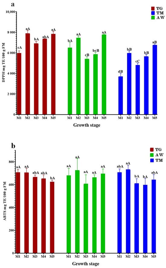 We also evaluated the plant extracts for their ability to scavenge free radicals using the ABTS radical decolorization assay. This assay is based on the reduction of ABTS+● radicals by the antioxidants present in the tested plant extracts. As depicted in Figure 1b, the outcomes were largely comparable to the DPPH activity, except TG, where the activity exhibited a decline after M3. Stage M2 had the highest amount of ABTS for TG, AW, and TM, with values of 705.7 ± 37, 725.4 ± 103, and 733.2 ± 35 mg TE /100 g FM, respectively. The lowest levels of ABTS were observed in M5 for TG (624 ± 16 mg TE/100 g FM), M3 for AW (607.4 ± 79 mg TE/100 g FM), and M4 for TM (598.1 ± 58 mg TE/100 g FM).