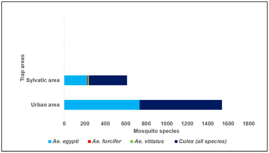 A total of 2150 mosquitoes were trapped in Bobo-Dioulasso from July to August 2023, including 976 (45.4%) Aedes spp. and 1174 (54.5%) Culex spp. The species and number of individuals collected were as expected in this study. Only the genus Aedes was included in the assays of this study. Of the 2150 mosquitoes collected, 69.0% (1484/2150) were collected in urban areas, while 31.0% (666/2150) were collected in sylvatic areas (Figure 2). Among the Aedes mosquitoes, 19.9% (195/976) were larvae that developed into adults after rearing. We identified 959 Ae. aegypti (476 males and 483 females), six Ae. furcifer (four males and two females), and 11 Ae. vittatus (seven males and four females). The repartition of the captured mosquitoes is displayed in Figure 2. All Aedes mosquitoes were divided into 39 pools with a maximum of 30 mosquitoes/pool, according to species, sex, and collection site.
