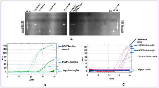 One-step multiplex amplification for DENV serotypes and CHIKV in mosquito samples. (A) Electrophoresis gel of multiplex RT-PCR amplification. M (100 bp DNA marker); DENV-1 (200 bp); DEN-3 (1359 bp); DMP: detect in mosquito pool; bp: base pair; NC: negative control. (B) Curves plots of multiplex RT-qPCR amplification. (C) Curves plots of ZDC (Zika, Dengue, and Chikungunya) from the Multiplex one-step RT-PCR kit.