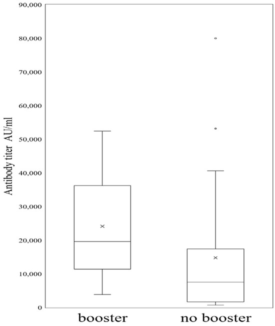 The Mann–Whitney U-test was used to investigate the median differences in antibody response between medical staff who took BNT162b2 booster shots and those who did not take a booster shot. The results in Figure 1 show that the antibody response was significantly higher among those who took the BNT162b2 booster shot (n = 12) with a median titer of 19,592 AU/mL compared to those who did not receive the booster shot (n = 22), with a median titer of 7513.55 AU/mL, p-value = 0.023.