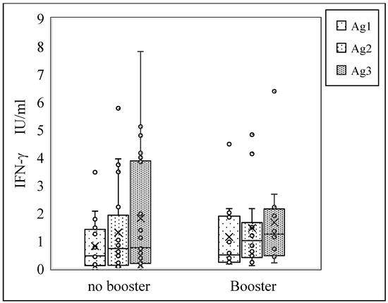 The Mann–Whitney U-test was performed to determine whether there were significant changes in the median T-cell response to SARS-CoV-2 antigens 1, 2, and 3 according to booster-dose status. The participants were divided into two groups based on their booster-vaccination status: those who did not receive a booster shot (n = 22) and those who did (n = 12). Among individuals without booster vaccination, the median differences in T-cell response were 0.46 IU/mL for Ag1, 0.725 IU/mL for Ag2, and 0.755 IU/mL for Ag3. In contrast, among those who received a booster shot, the median differences were slightly higher, with values of 0.495 IU/mL for Ag1, 1.01 IU/mL for Ag2, and 1.245 IU/mL for Ag3. The calculated X2 values were 107.5 for Ag1, 106.0 for Ag2, and 116.5 for Ag3, indicating substantial variability in T-cell response between the two groups across all antigens. However, the corresponding p-values for each antigen did not reach statistical significance, with values of 0.377 for Ag1, 0.349 for Ag2, and 0.576 for Ag3. Figure 2 shows that the median differences were not statistically significant depending on whether or not medical staff received the booster shot, p-value > 0.05