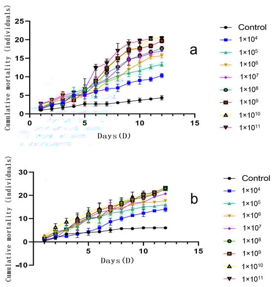 The variation in cumulative mortality count under different treatments for Bactrocera dorsalis adults over 12 days. Note: Figure (a) shows the cumulative mortality of female Bactrocera dorsalis adults; Figure (b) shows the cumulative mortality of male Bactrocera dorsalis adults. Error bars = SD, data analyzed by non-linear regression.