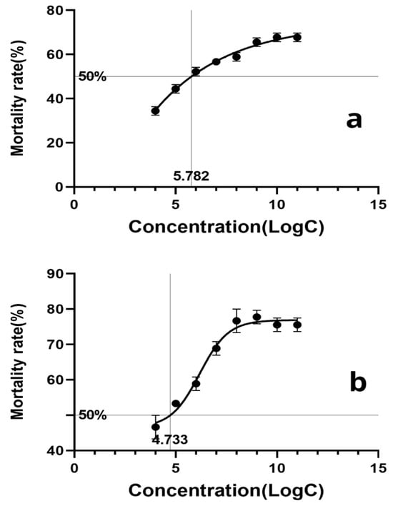 The calculation of lethal concentration for Bactrocera dorsalis adults over 12 days. Note: (a) The calculation of lethal concentration for female Bactrocera dorsalis adults; (b) the calculation of lethal concentration for male Bactrocera dorsalis adults. Error bars indicate significant differences among different replications of each treatment.