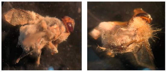 - Usman, M.; Wakil, W.; Piñero, J.C.; Wu, S.; Toews, M.D.; Shapiro-Ilan, D.I. Evaluation of Locally Isolated Entomopathogenic Fungi against Multiple Life Stages of Bactrocera zonata and Bactrocera dorsalis (Diptera: Tephritidae): Laboratory and Field Study. Microorganisms 2021, 9, 1791. [Google Scholar] [CrossRef] [PubMed] [PubMed Central]