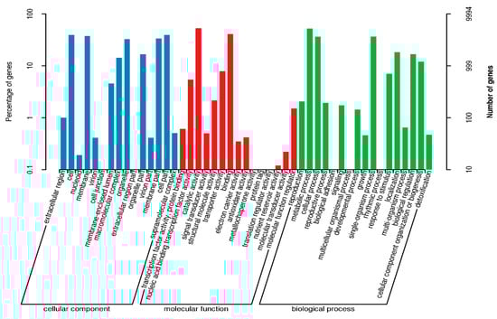 Gene sets were annotated using different databases: GO Annotation, KEGG Annotation, KOG Annotation, Pfam Annotation, Swissprot Annotation, TrEMBL Annotation, and nr Annotation (Table 3). A total number of 13,869 genes were annotated, indicating that the majority of genes obtained at least one functional annotation, providing a solid foundation for subsequent gene function studies. For example, annotations varied across databases: GO Annotation annotated 9994 genes, KEGG Annotation annotated 3775 genes, KOG Annotation annotated 7059 genes, Pfam Annotation annotated 10,510 genes, Swissprot Annotation annotated 10,651 genes, TrEMBL Annotation annotated 13,862 genes, and nr Annotation annotated 13,867 genes. For genes with lengths in the range of 100 ≤ length < 300 bp, annotations varied from 913 (KEGG) to 3733 (All Annotated), indicating that even shorter gene fragments can obtain a certain degree of annotation. However, the genes with lengths greater than or equal to 300 bp generally received higher annotation quantities. For instance, the nr database annotated 9995 genes, indicating that longer genes are more likely to receive functional annotations.
