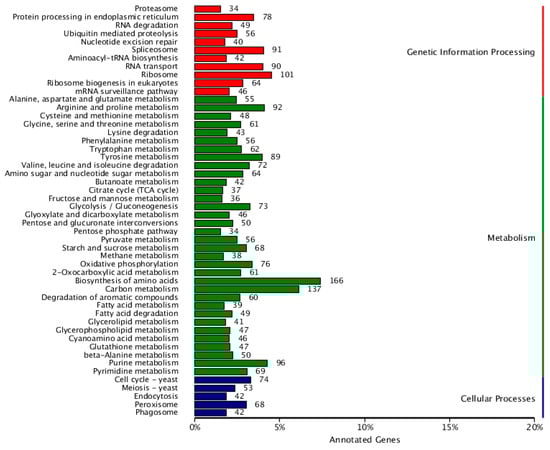 Metabolism: Categories such as “Biosynthesis of amino acids” (166 genes, approximately 16%) and “Purine metabolism” (96 genes) encompass a relatively large number of genes, indicating that F. solani KMZW-1 has complete pathways for amino acid synthesis, essential for cell growth, and DNA synthesis.