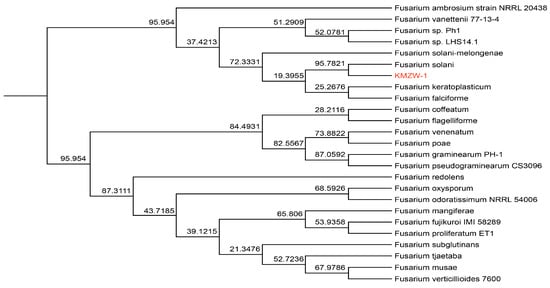 Phylogenetic tree of Fusarium solani KMZW-1 with different strains.