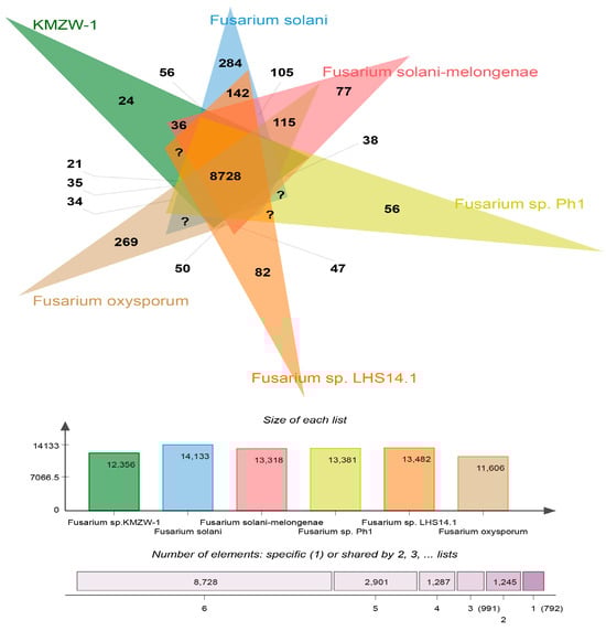 Genomic comparison using OrthoFinder reveals distinct and shared genetic characteristics of F. solani KMZW-1 in relation to other Fusarium strains (Figure 10). Notably, F. solani KMZW-1 contains 269 unique genes, underscoring its genetic distinctiveness and potential for unique ecological adaptations. The strain shares 142 genes with F. solani, indicating a closer evolutionary relationship with this species. In contrast, it shares fewer genes with F. solani-melongenae (77 genes), Fusarium sp. Ph1 (115 genes), Fusarium sp. LHS14.1 (82 genes), and the least with F. oxysporum (56 genes), suggesting varying degrees of genetic divergence among these species. The core genome shared across all analyzed strains consists of 8728 genes, likely representing essential functions conserved within the Fusarium species. These findings highlight the unique genetic profile of F. solani KMZW-1 and provide insights into its evolutionary relationships with other Fusarium strains.