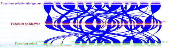 Collinearity analysis between the genomes of Fusarium solani KMZW-1, Fusarium solani-melongenae, and Fusarium solani.