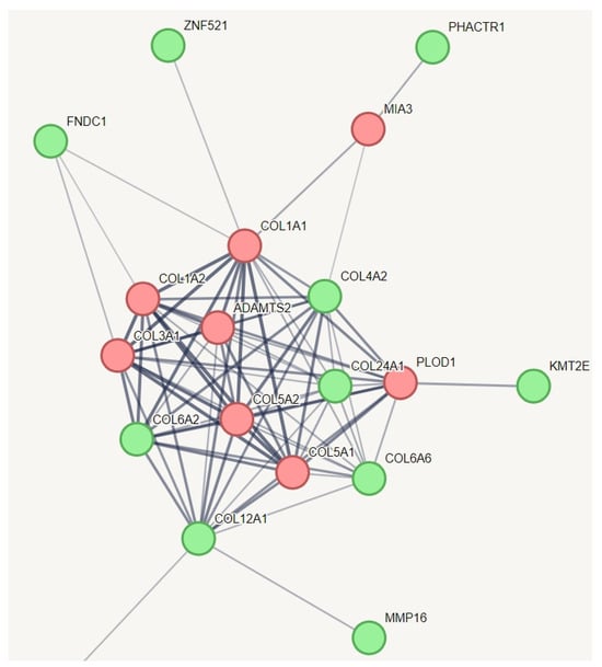 | Collagen chain trimerization | COL6A2, COL6A6, COL4A2, COL12A1, COL24A1, KMT2E, COL24A1, FNDC1, ZNF521, PHACTR1, and MMP16. | 77% (14) |