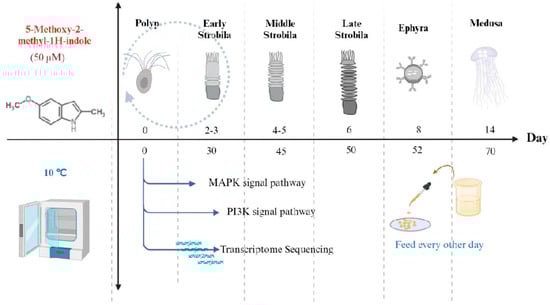 - Fuchs, B.; Wang, W.; Graspeuntner, S.; Li, Y.Z.; Insua, S.; Herbst, E.; Dirken, P.; Böhm, A.; Hemmrich, G.; Sommer, F.; et al. Regulation of polyp-to-jellyfish transition in Aurelia aurita. Curr. Biol. 2014, 24, 263–273. [Google Scholar] [CrossRef] [PubMed]