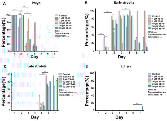 3.2. YS-49 Inhibits the Metamorphosis of Aurelia coerulea Polyps