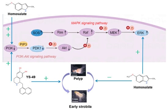 Chen, J.; Geng, X.; Li, B.; Xie, J.; Ma, J.; Qin, Z.; Wang, M.; Yang, J. Homosalate and ERK Knockdown in the Modulation of Aurelia coerulea Metamorphosis by Regulating the PI3K Pathway and ERK Pathway. Curr. Issues Mol. Biol. 2024, 46, 11630-11645. https://doi.org/10.3390/cimb46100690