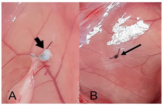 (A). Bacterial membrane implantation. The arrow indicates the membrane sutured to the animal’s peritoneum, 60 days after surgery. (B). The arrow indicates the nylon thread sutured in the peritoneum (sham), 60 days after surgery.