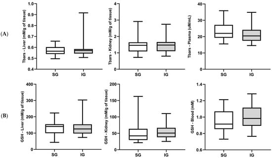 Oxidative stress was evaluated in blood, plasma, and tissues (liver and kidney). The tissues were segmented, and 250 mg of tissue was mixed with 1.5 mL of 1.15% KCl solution. The tissue was then sonicated using a Sonics Vibra-Cell® Ultrasonic Atomizer for two cycles of 30 s at 35% intensity, forming the homogenate sample, being stored at −80 °C until analysis.