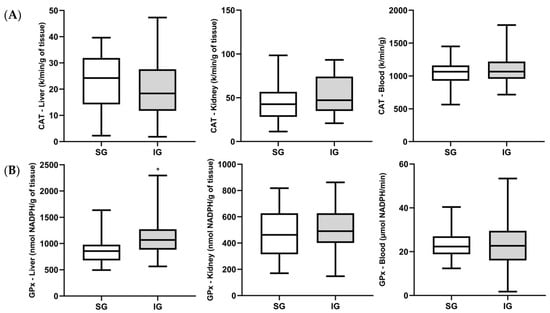 The activity of the antioxidant enzyme GPx was determined in whole blood and homogenate, based on NADPH oxidation. The blood (or homogenate) was diluted in a solution containing reduced glutathione, glutathione reductase, NADPH, sodium azide, and 70 μL of H2O2 [30]. GPx activity was monitored for two minutes at 340 nm. By measuring the decay of NADPH absorbance, GPx activity was determined, proportional to NADPH consumption. The data were expressed in µmol NADPH/min or µmol NADPH/min/g tissue.