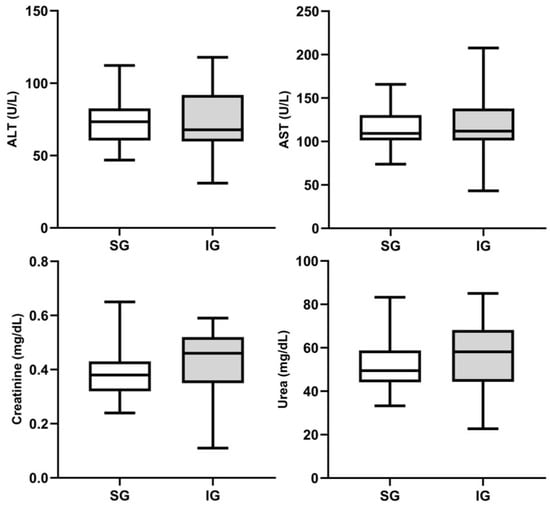 Biochemical parameters between implanted and sham groups, considering liver markers ALT (alanine aminotransferase) and AST (aspartate aminotransferase) and kidney markers creatinine and urea. Data are expressed as mean ± standard deviation.