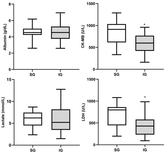 Box-plot of biochemical parameters between sham and implanted groups, considering albumin, creatine kinase MB (CK-MB), lactate, and lactate dehydrogenase (LDH). Data are expressed as mean ± standard deviation. Note: * p < 0.05 compared to the sham group.