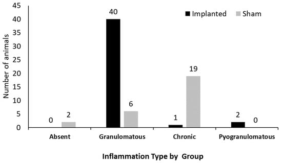 The predominant type of inflammation in the implanted group was a granulomatous, foreign body type, occurring in 40 (93%) animals, followed by pyogranulomatous in two (5%) animals and chronic mononuclear inflammation in one (2%) of the rats. In the sham group, 19 (70.5%) individuals presented chronic inflammation of the mononuclear type, and six (22%) of the granulomatous type, whereas two (7.5%) animals did not present signs of an inflammatory process (Figure 6 and Figure 7) (Supplementary Material).