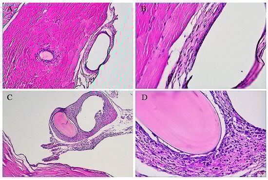 Histopathological grades of inflammation observed in animals in the sham group. (A). Grade 1 (mild) inflammatory process at 40× magnification. HE, 4× objective. (B). Detail of the inflamed region at 400× magnification. HE, 40× objective. (C). Grade 2 (moderate) inflammation at 40× magnification. HE, 4× objective. (D). Detail of the inflamed region at 400× magnification. HE, 40× objective.