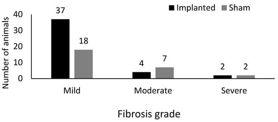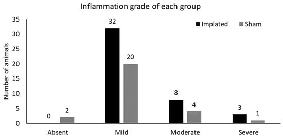 Regarding the intensity (degree) of inflammation, in the implanted group, 32 (74%), 8 (19%), and 3 (7%) were classified as mild, moderate, and intense, respectively. In the sham group, 2 (7.4%) animals were classified as having zero (absence) inflammation, 20 (74%) as having a slight degree, 4 (15%) as having a moderate degree, and 1 (3.6%) as having an intense degree of inflammation (Figure 7 and Figure 8).