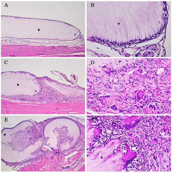 The inflammatory process was classified as: neutrophilic, with a predominance of neutrophils without signs of infection; mononuclear, with a predominance of lymphocytes, plasmocytes, monocytes, and macrophages; granulomatous, with the presence of foreign body giant cells granuloma; pyogranulomatous, with the presence of neutrophils, macrophages, and giant cells in the same sample; and eosinophilic, with a predominance of eosinophils at the inflammatory site.