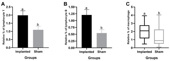 (A,B) Mean (+/− SEM) percentage of CD3 and CD20 lymphocytes, respectively, between the implanted and sham groups. (C) Median (Max—Min) percentage of macrophages between the implanted and sham groups. Statistical differences (p < 0.05) are indicated within each group by lowercase letters.
