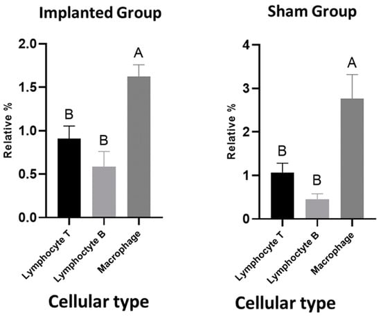 Mean (+/− SEM) percentage of T and B lymphocytes, as well as macrophages, in the implanted group and sham group. Statistical differences are indicated by different uppercase letters (p < 0.05).