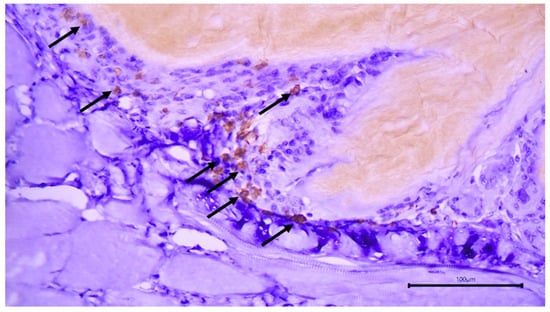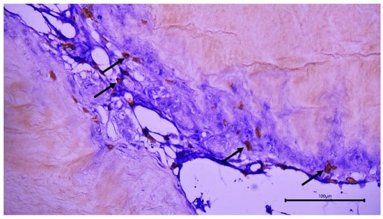 BC implantation site. Immunohistochemical staining for CD20. Positive staining of B lymphocytes around the membrane (arrows).