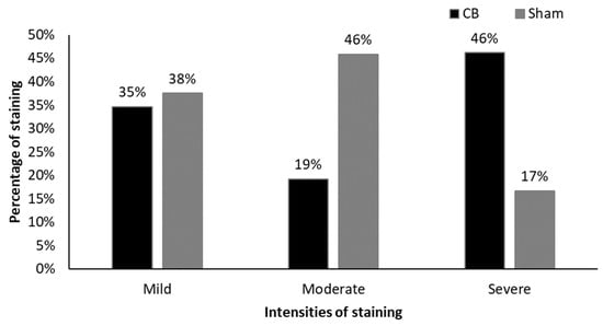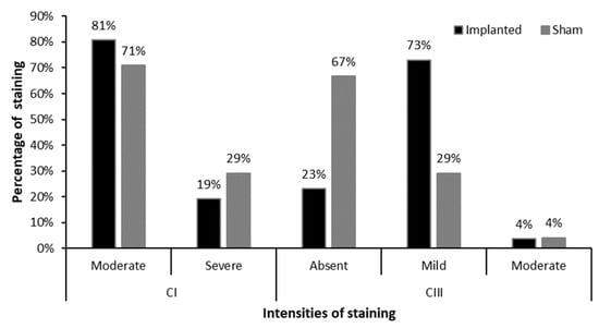 In the implanted group (IG) the immunohistochemistry for CI exhibited a moderate staining in 21 out of 26 animals (81%), while 5 (19%) showed intense staining (Figure 15 and Figure 16). In the sham group, 17 out of 24 animals (71%) demonstrated moderate staining for CI, and 7 (29%) displayed intense staining (Figure 15 and Figure 17).