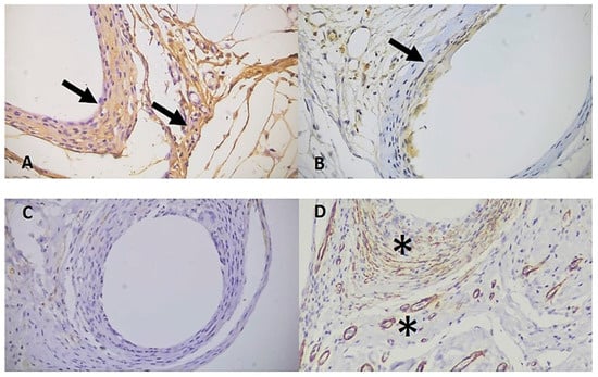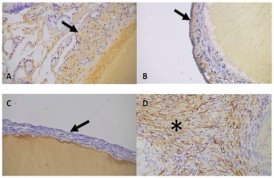 Degrees of staining for the collagen types and α-SMA in the animals of the implanted group. (A). Observe moderate staining for CI around the membrane (arrow) (B). Observe discrete staining for CIII around the membrane (arrow) (C). Observe absence of staining for CIV around the membrane (arrow) (D). Observe intense staining of myofibroblasts and blood vessels around the membrane (*). IHC for CI, CIII, CIV, and α-SMA respectively at 400× magnification, 40× objective.