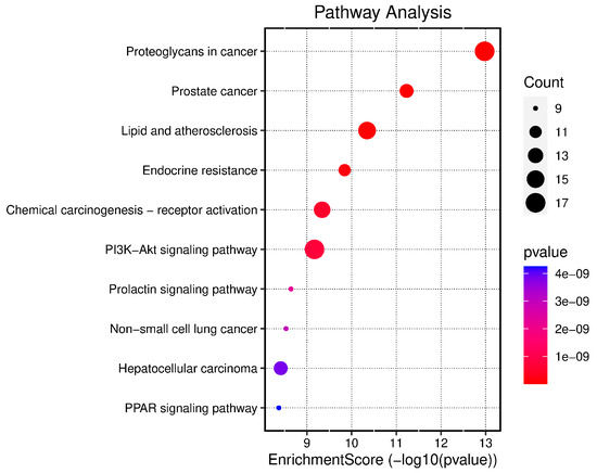Visualization of top 10 KEGG pathways in a dot-plot diagram (The pathway is shorted by Fold enrichment, dots show the gene count number, the x-axis shows −logP, and the color shows the p-value).