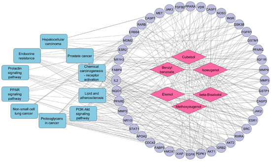 Compound–target–pathway network constructed by Cytoscape software (blue round rectangle nodes represent pathway names, pink diamond-shaped nodes represent compounds, purple circular-shaped nodes represent targets, and edges represent the relation between nodes).