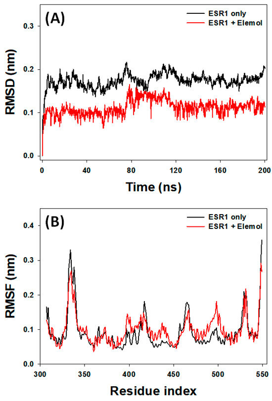 RMSD is a critical measure for evaluating the stability of protein–ligand complexes during MD simulations, as it quantifies deviations of the structure from its initial state throughout the simulation period [58]. In this study, RMSD (Cα-atoms) for ESR1 alone and the ESR1–Elemol complex was analyzed over a 200 ns simulation period. For ESR1 alone, RMSD showed fluctuations during the initial 5 ns before stabilizing. The RMSD of ESR1 alone ranged from 0.137 to 0.217 nm, with an average value of 0.175 ± 0.008 nm from 5 to 200 ns (Figure 9A). Similarly, the RMSD of the ESR1–Elemol complex varied during the first 5 ns but stabilized as favorable interactions between the protein and ligand developed. Throughout the 5 to 200 ns period, the RMSD of the ESR1–Elemol complex ranged from 0.064 to 0.166 nm, with an average of 0.112 ± 0.006 nm.