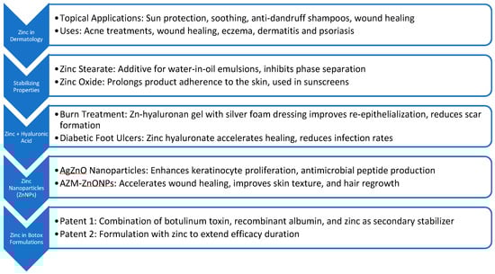 Given zinc’s extensive properties and its crucial role in skin health, this review aims to provide an overview of the uses of zinc in dermatology, focusing on its applications with botulinum toxin and stabilizing properties. By examining current research and clinical practices, this article offers an original perspective on the multifaceted role of zinc in enhancing dermatological treatments and product formulations, shedding light on areas that have been largely overlooked in existing literature (as summarized in Figure 1).