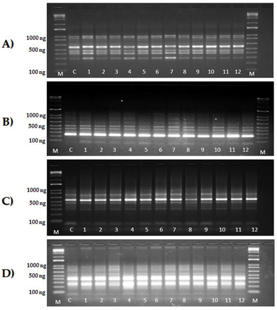 A total of 2% agarose gel with the monomorphic electrophoretic profile of the control and 12 somaclone samples derived from the cultivar Grande Naine. C = control (GN), 1–12: somaclones (Table 1). M = Ladder marker (Invitrogen®, Waltham, MA, USA). (A–D): IRAP and REMAP marker primer combinations (A) LTR7286 + 8081 (REMAP), (B) 5′LTR + Sukkula (IRAP), (C) LTR7286 + 8385 (REMAP), and (D) LTR7286 + 8386 (REMAP).