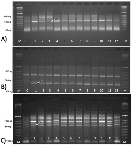 Electrophoretic profile of ‘Grande Naine’ control and somaclones (1–12) on 2% agarose gel. C = control (GN), 1–12: somaclones (Table 1). M = Ladder marker (Invitrogen®). (A) Band 1AF (white arrow), LTR6149 (T1B2P6) + Nikita (T1B2P6: 1–12), (B) Band 2AF (white arrow), 3′LTR (T1B2P2) + Nikita (T1B2P2: 1–11), and (C) Band 3AF (white arrow), Sukula + LTR6150 (T1B2P2: 1–11).