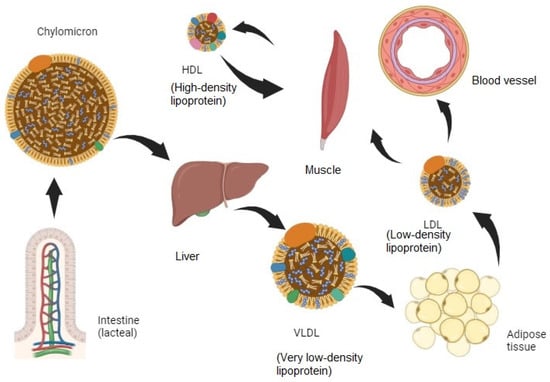 The importance of hyperlipidemia in humans has been emphasized over the years. The complications of hyperlipidemia include endocrine diseases such as diabetes and pancreatitis but fatal cardiovascular diseases such as stroke and myocardial infarction are also closely related to this condition [1,2]. Therefore, researchers have conducted studies aiming to prevent such complications through efforts to improve hyperlipidemia and, in the process, drugs to improve hyperlipidemia such as Statins and Fenofibrate [3] have been developed [4]. Lipids, which are absorbed into the body through lacteals in the small intestine after digestion, must travel through blood vessels, but since lipids are fat-soluble, not water-soluble, they cannot dissolve in the blood vessels and move on their own. Therefore, they form a lipoprotein complex and move throughout the body’s organs, changing into various forms including chylomicron, very low-density lipoprotein (VLDL), low-density lipoprotein (LDL), and high-density lipoprotein (HDL) (Figure 1). When chylomicrons are absorbed from a lacteal lymphatic vessel [5] in the small intestines, they pass through the liver to become VLDLs, then to adipose tissue to become LDLs, and then to muscles and blood vessels and other organs to condense into HDLs, and the low-density, high-volume lipids are removed.