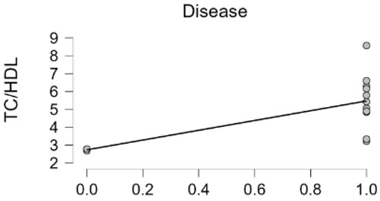 Upon analyzing the correlation with the TC/HDL ratio by dividing the presence or absence of hyperlipidemia-related endocrine diseases, such as hypothyroidism, Cushing’s, gallbladder mucocele, and liver cancer into 1 and 0, concurrent disease and TC/HDL value showed a significant strong positive correlation (Pearson’s r 0.599, p-value 0.031, Figure 2). Interestingly, the dogs that had a lower TC/HDL value of less than 3 had no disease but other dogs with TC/HDL values of greater than 3 had various diseases. These data suggest that the TC/HDL cut-off value as a healthy condition biomarker could be 3, which is similar in human medicine [11] (Table 3).