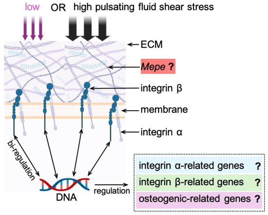 Osteoblasts sense mechanical forces and translate them into biochemical signals to regulate cell shape and function via the extracellular matrix, gap junctions, integrins, ion channels, focal adhesion kinases, and the cytoskeleton (e.g., actin filaments, microtubules, and intermediate filaments) [25,26]. Integrins, as bridges, mediate mechanical signals between the ECM and the cytoskeleton via focal adhesion kinases, are able to sense matrix features, e.g., texture, stiffness and external forces, and transfer these signals into biochemical or biological signals [27,28]. This transduction process is called “mechanical signal transduction” [27]. When integrins are active, they recruit different integrin associated proteins (IAP) near the cell membrane, e.g., talin, vinculin, and kindlin. The IAPs enhance the number of specific cell surface receptors, which have a similar function to integrins and involve amplifying effects, such as the opening of mechanically gated channels (e.g., PIEZO1 channels) [29,30]. IAPs convert the signal received by integrins to the cytoskeleton (e.g., actin filaments), which undergo contraction, changing the tension of the phospholipid bilayer on the membrane, thereby leading to the opening of mechanically gated channels [27,29,30]. Mechanical force also induces substantial changes in osteoblast cell body and nucleus volume, which are accompanied by changes in integrin and paxillin [26]. Integrins emerge as cell adhesion receptors, which mediate the interaction between cells and the extracellular matrix and act as mechanotransducers, regulating osteogenesis [31,32]. MC3T3-E1 pre-osteoblast proliferation is decreased when the integrin gene is knocked out. Furthermore, integrins (e.g., β1 integrin) increase osteogenic differentiation and ECM production by mechanically loaded osteoblasts, indicating that integrins are important for ECM integrity, biomechanical properties, and bone quality in vivo [33]. Based on the different integrin binding characteristics, integrins are divided into four types, i.e., leukocyte cell-adhesion integrins (α4β1, α9β1), laminin-binding integrins (α1β1, α3β1), collagen (GROGER)-binding integrins (α1β1, α2β1), and RGD-binding integrins (α5β1, αvβ3) [34]. These integrin isoforms are tissue-based (or specific) and developmentally regulated [35]. Their properties are still not as well understood as those of the α and β subunits. Importantly, integrins interact with extracellular matrix proteins, e.g., osteopontin, fibronectin, fibrinogen, and vitronectin, which highly likely contain small peptide sequences (ARG-Gly-Asp (RGD)) as integrin recognition motifs [35,36]. These motifs promote cells to adhere to the extracellular matrix and convert mechanical force signals into biochemical signals in the cells via integrin α and β subunits [37]. However, little is known about how Mepe expression is associated with changes in integrin α and/or β subunit expression in response to mechanical loading of different magnitudes in bone cells. More specifically, whether, and to what extent, pulsating fluid shear stress (PFSS) influences Mepe expression through the modulation of integrin α and/or β subunit expression in osteoblasts is uncertain (Figure 1).