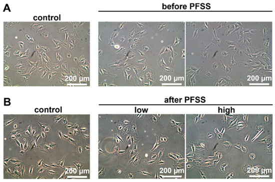 Before and after low- or high-PFSS treatment, the morphology of cells on the glass slides was observed by light microscopy (Leica, Wetzlar, Germany). Three pictures were taken randomly from each glass slide under 10× magnification. Then, the pictures were used to assess cell morphology of cells treated without/with low or high PFSS.