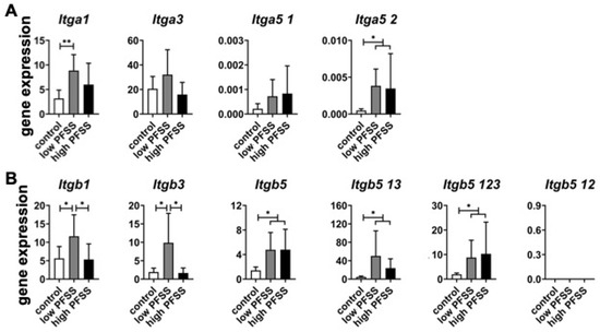 Analysis of integrin α subunit gene expression (Figure 4A) revealed that low PFSS significantly increased expression of Itga1 (2.8-fold) and Itga5 2 (8.0-fold). High PFSS significantly enhanced expression of Itga5 2 (7.3-fold). Both low and high PFSS did not affect Itga3 and Itga5 1 expression (Figure 4A).