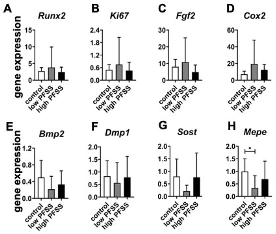 One-hour low and high PFSS did not affect Runx2 expression (Figure 5A). Expression levels of Ki67, Fgf2, and Cox2 showed a similar trend, i.e., they were also not affected by low or high PFSS (Figure 5B–E). Bmp2, Dmp1, and Sost genes displayed similar expression levels, and were not affected by low or high PFSS (Figure 5E–G). Interestingly, low but not high PFSS significantly decreased Mepe expression (0.3-fold; Figure 5H).