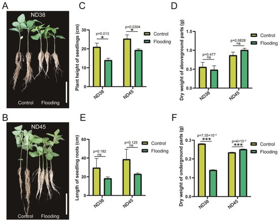 Impacts of flooding on the growth of soybean plants from two cultivars: Nanxiadou38 (ND38) and Nanxiadou45 (ND45). (A,B) Soybean seedlings demonstrated the appearance of dwarf forms under flooding stress. (C,D) Seedling height (C) and root length (D) showed distinct differences after flooding compared with the control group. (E,F) The comparison of aboveground (E) and underground (F) dry weight between flooding and control groups. * p ≤ 0.05, *** p ≤ 0.001 (Student’s t-test).