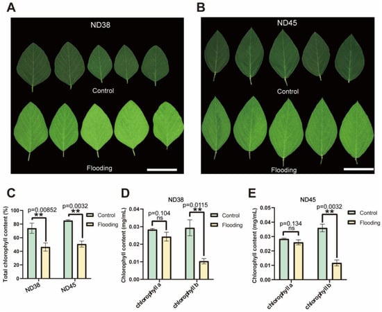 Analyses of chlorophyll content in soybean leaves under flooding conditions. (A,B) Flooded and normal leaves of ND38 (A) and ND45 (B). (C–E) Determination of total chlorophyll (C), chlorophyll a and chlorophyll b content of ND38 (D) and ND45 (E) in flooded and normal leaves from both cultivars. ** p ≤ 0.01 (Student’s t-test). Error bars indicate the standard error of the mean (n = 3).