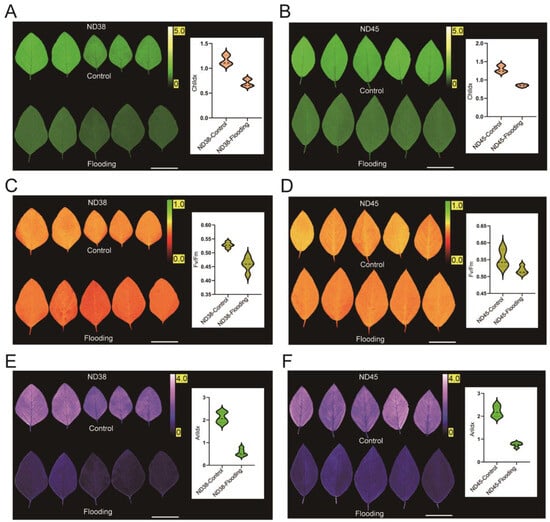 To assess the impact of flooding treatment on the photosynthetic capacity and performance of soybean plants, changes in ChlIdx, Fv/Fm and AriIdx were analyzed. We observed a notable reduction in ChlIdx of both cultivars following flooding treatment (Figure 3A,B). Additionally, ND38 exhibited a greater reduction in Fv/Fm than ND45 (Figure 3C,D). Furthermore, in the measurement of anthocyanins, we found that AriIdx decreased nearly twofold in both cultivars compared to the control group (Figure 3E,F). Overall, flooding significantly affected the photosynthetic processes in both soybean cultivars.