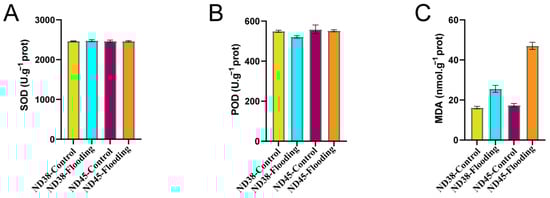 The levels of SOD, POD, and MDA were measured to evaluate the antioxidative response and oxidative damage induced by flooding treatment. Absorbance readings were taken at 450 nm, 420 nm, and 532 nm, respectively. SOD and POD, as key antioxidants, showed no significant differences in activity between the flooding and control groups for both cultivars (Figure 4A,B). However, MDA levels, an indicator of oxidative damage, displayed significant changes after flooding, particularly in the ND45 cultivar (Figure 4C). This suggests that ND45 may be more susceptible to oxidative damage under flooding conditions compared to ND38, highlighting differences in their antioxidative defense mechanisms.
